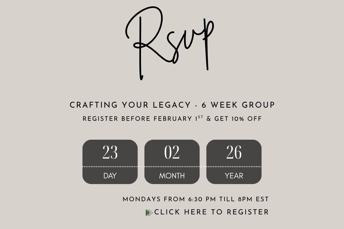 Crafting Your Legacy: This group is designed to help you intentionally craft your legacy, one that reflects your values, faith, and the unique purpose God has placed on your life. Through thoughtful reflection, guided conversations, and spiritual encouragement, you’ll gain clarity on the story you're living and the impact you want to leave behind. Whether you're looking to pass on wisdom, strengthen your spiritual influence, or create meaningful change, this is a space where your legacy begins to take shape with intention and grace.